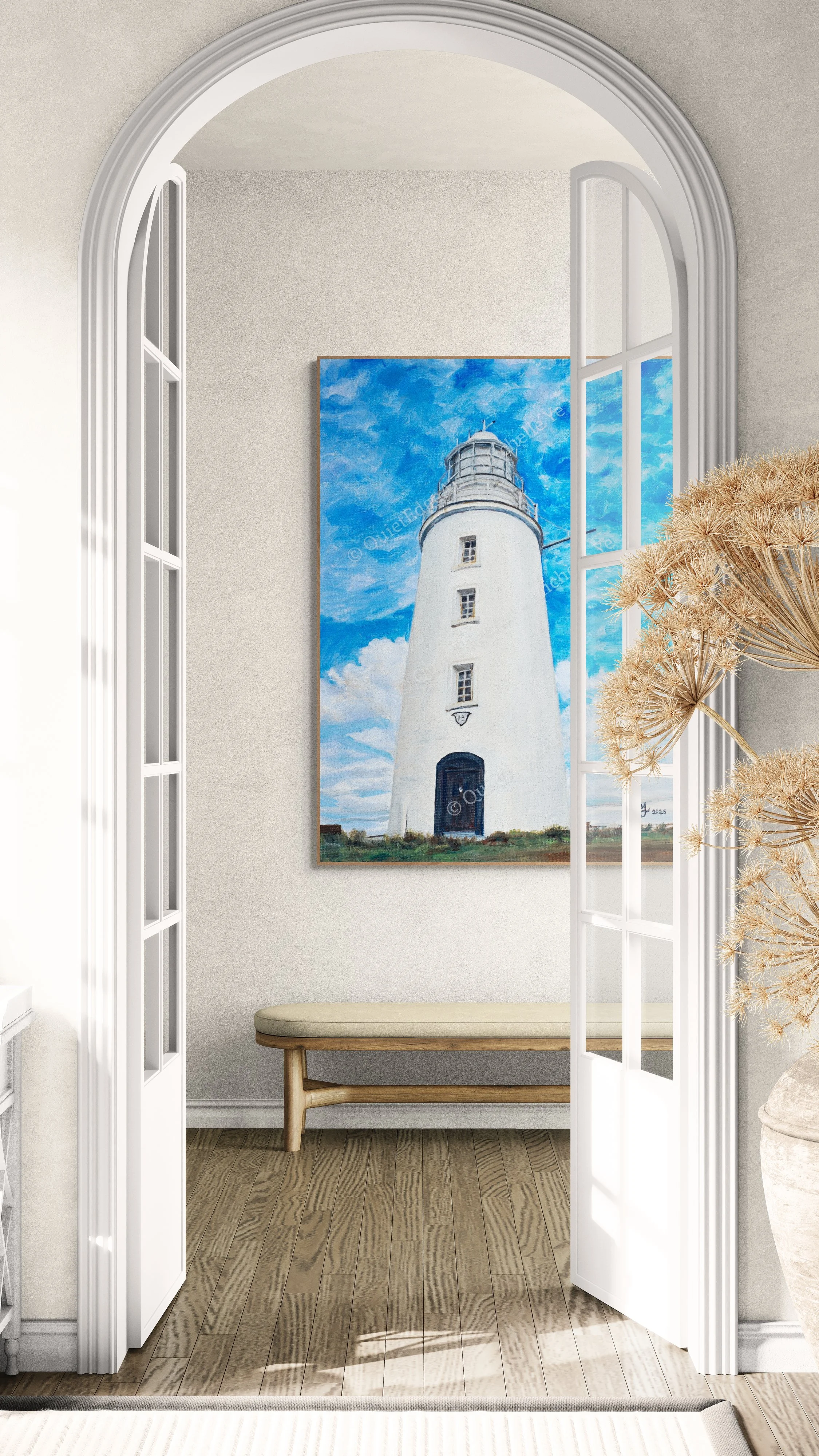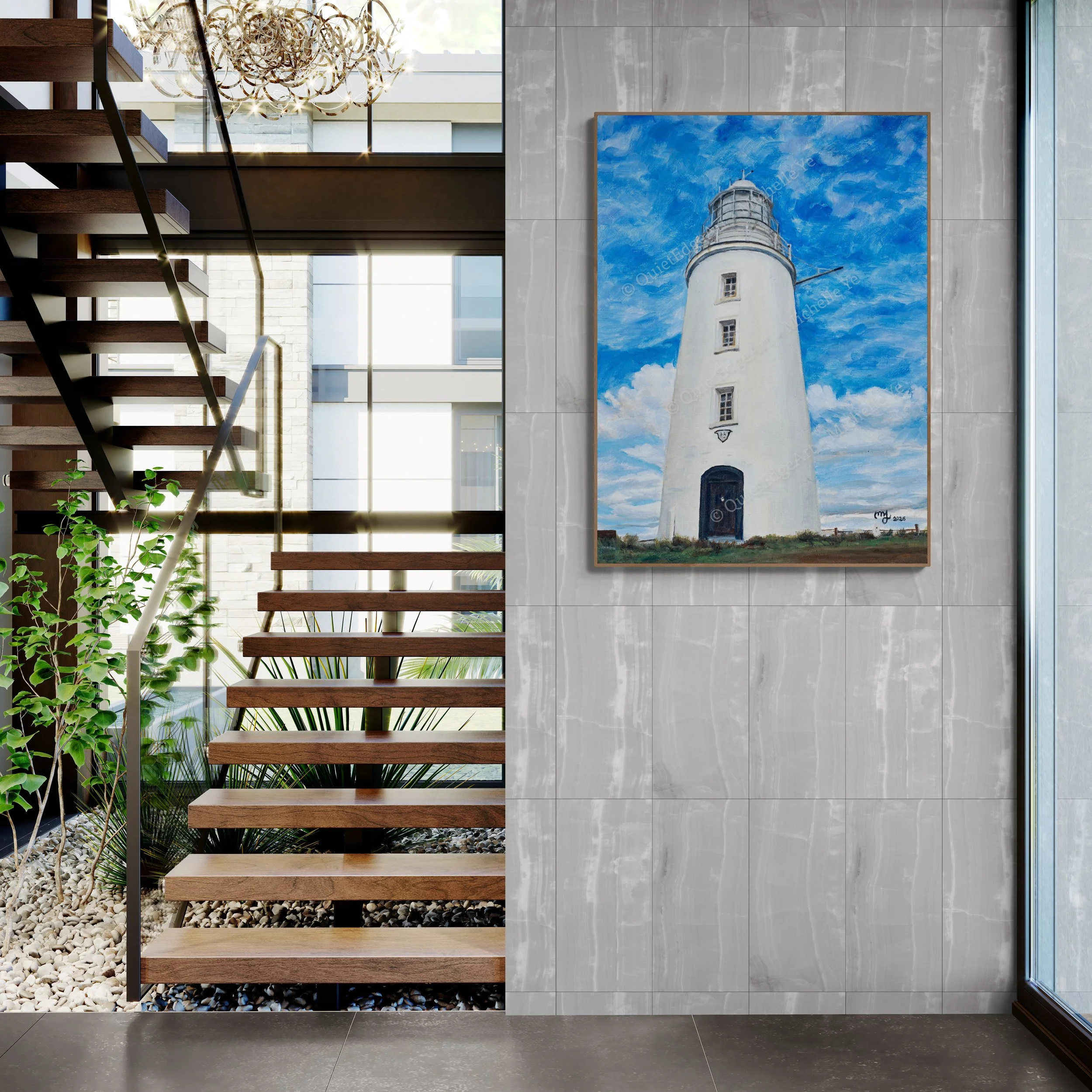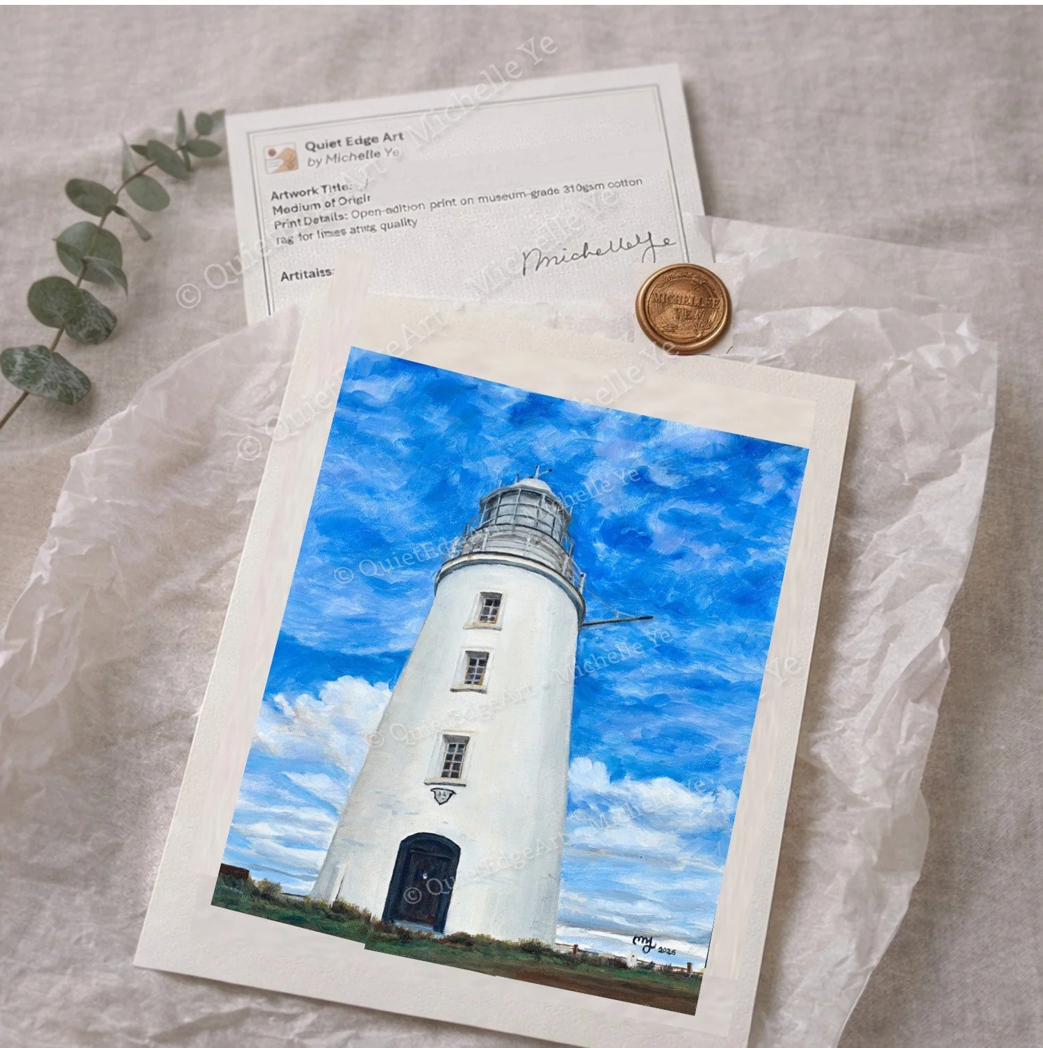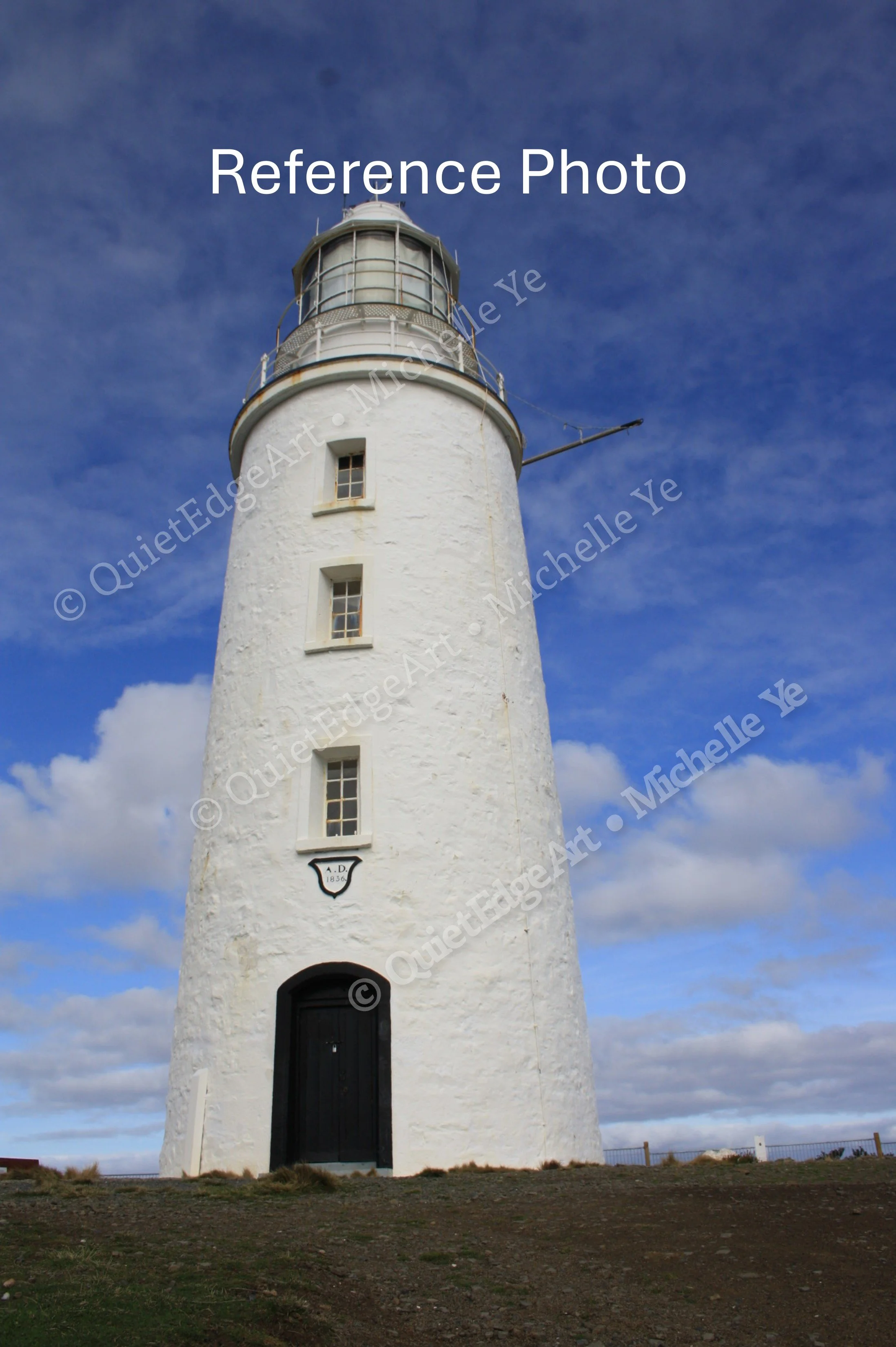 A painting of Bruny Island Lighthouse, capturing its quiet presence on the rugged Tasmanian coastline. The scene focuses on the contrast between the solid, weathered structure and the open, shifting light around it. There is a sense of stillness, but also movement in the sky and sea - like the landscape is always changing, even when the lighthouse stands steady.