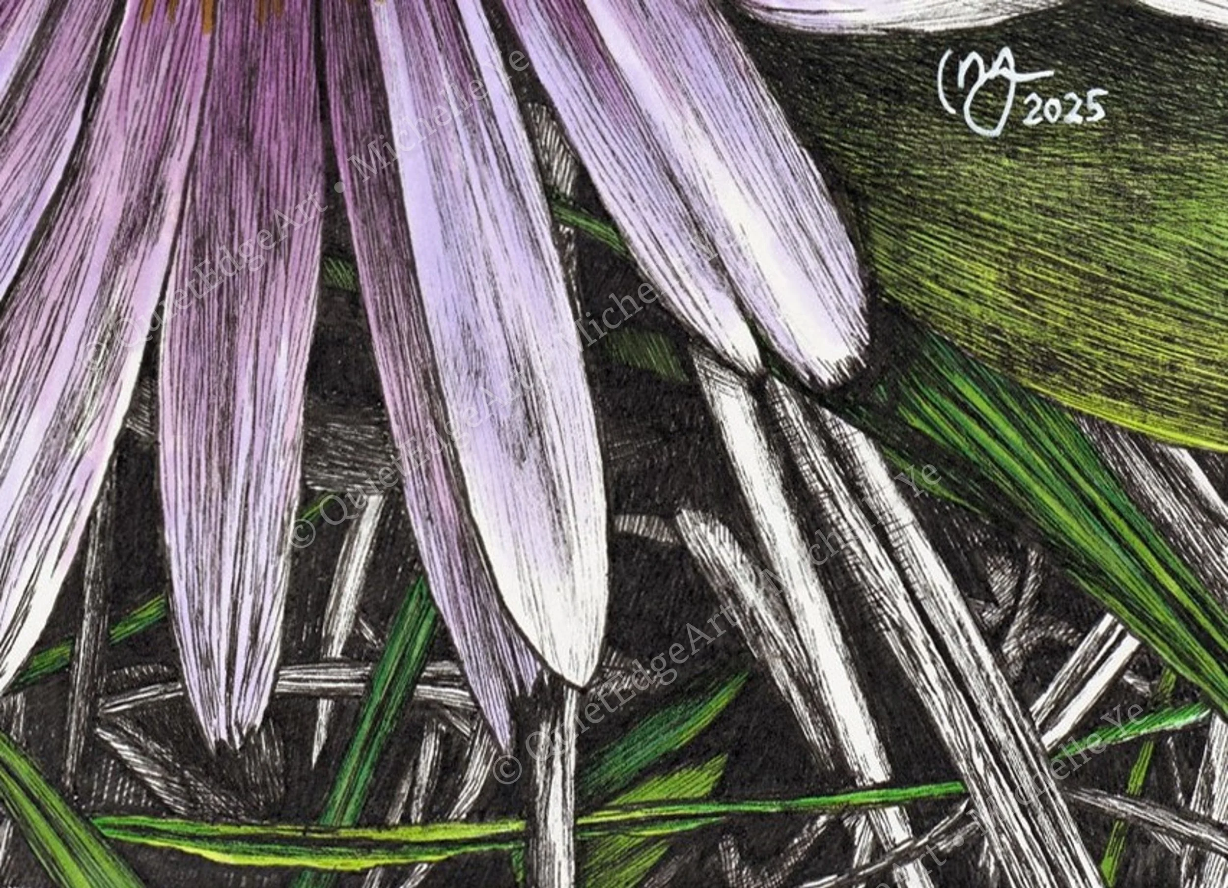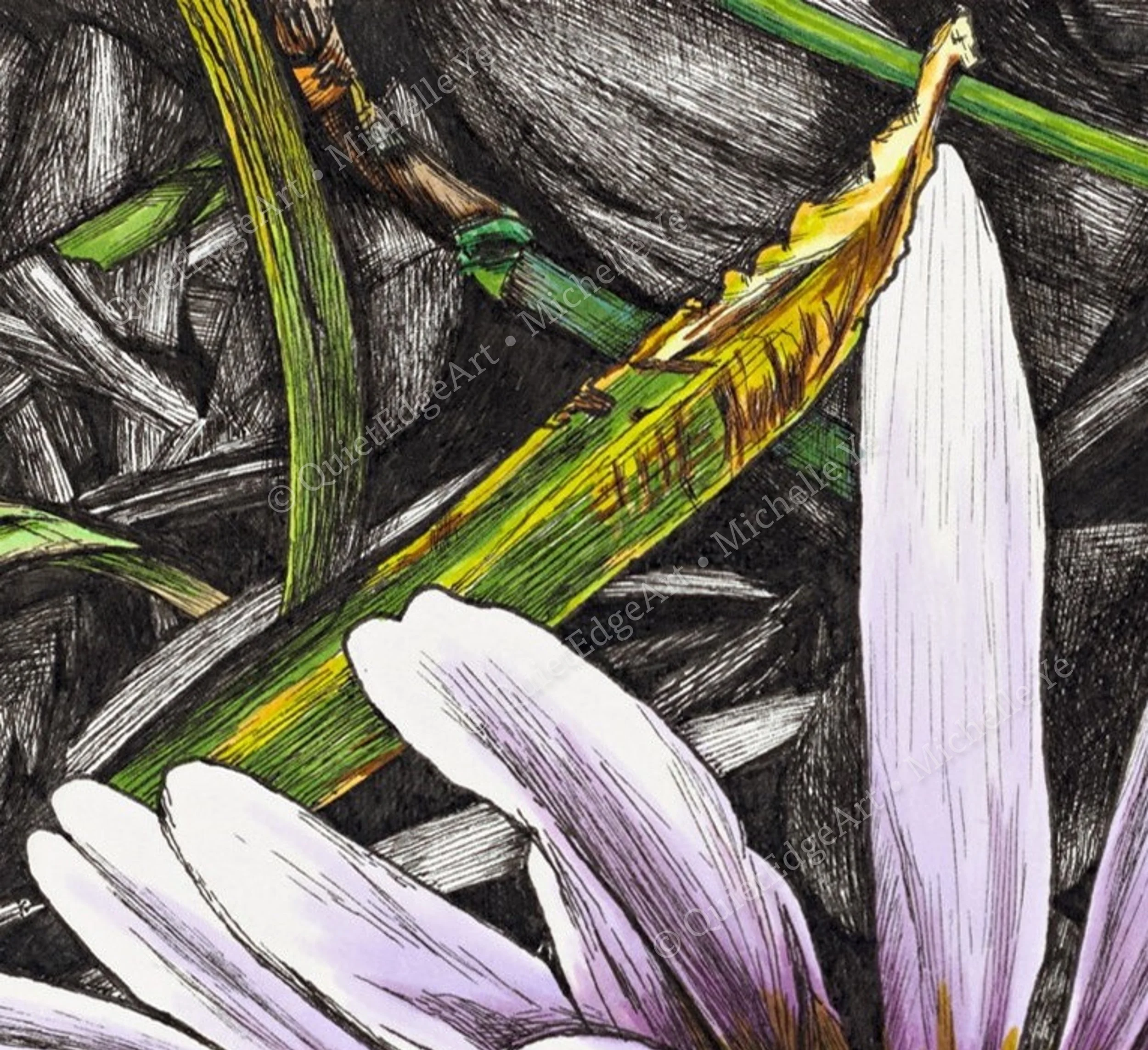 A vivid, close-up portrayal of a tiny little daisy nestled within a tangle of grass and twigs. The delicate lavender-tinted petals radiate gently from the bright golden centre, capturing both fragility and resilience. With intricate penwork and layered hues, the composition draws attention to the quiet beauty often overlooked in natureβs underfoot moments. The contrast between the soft bloom and the textured surroundings speaks to finding grace in unlikely places.