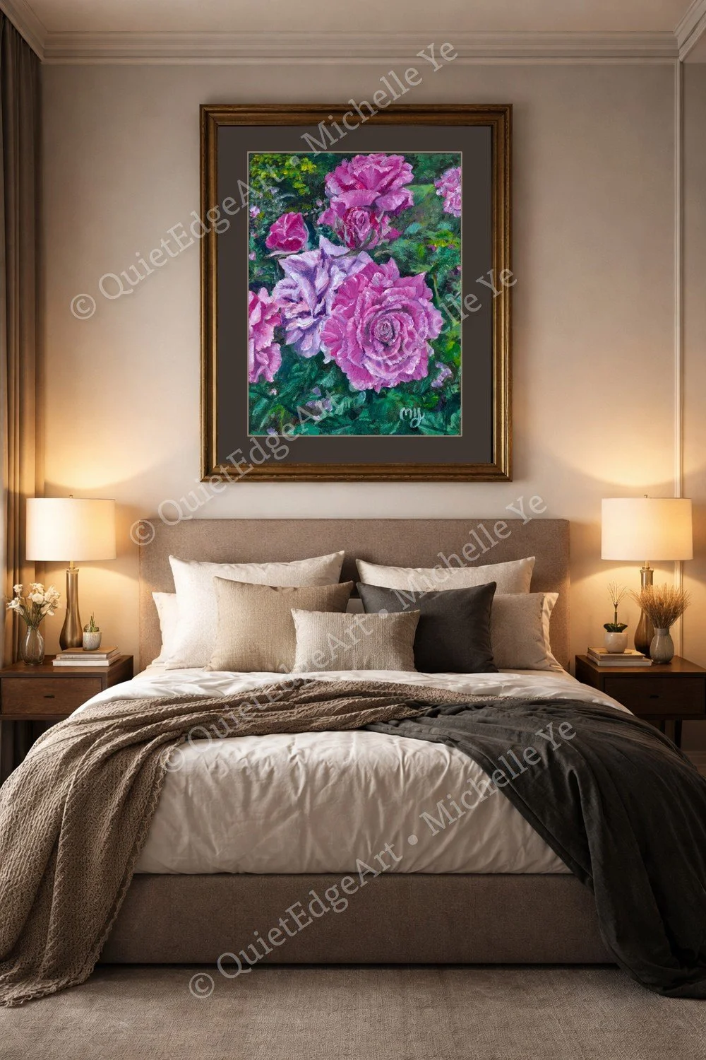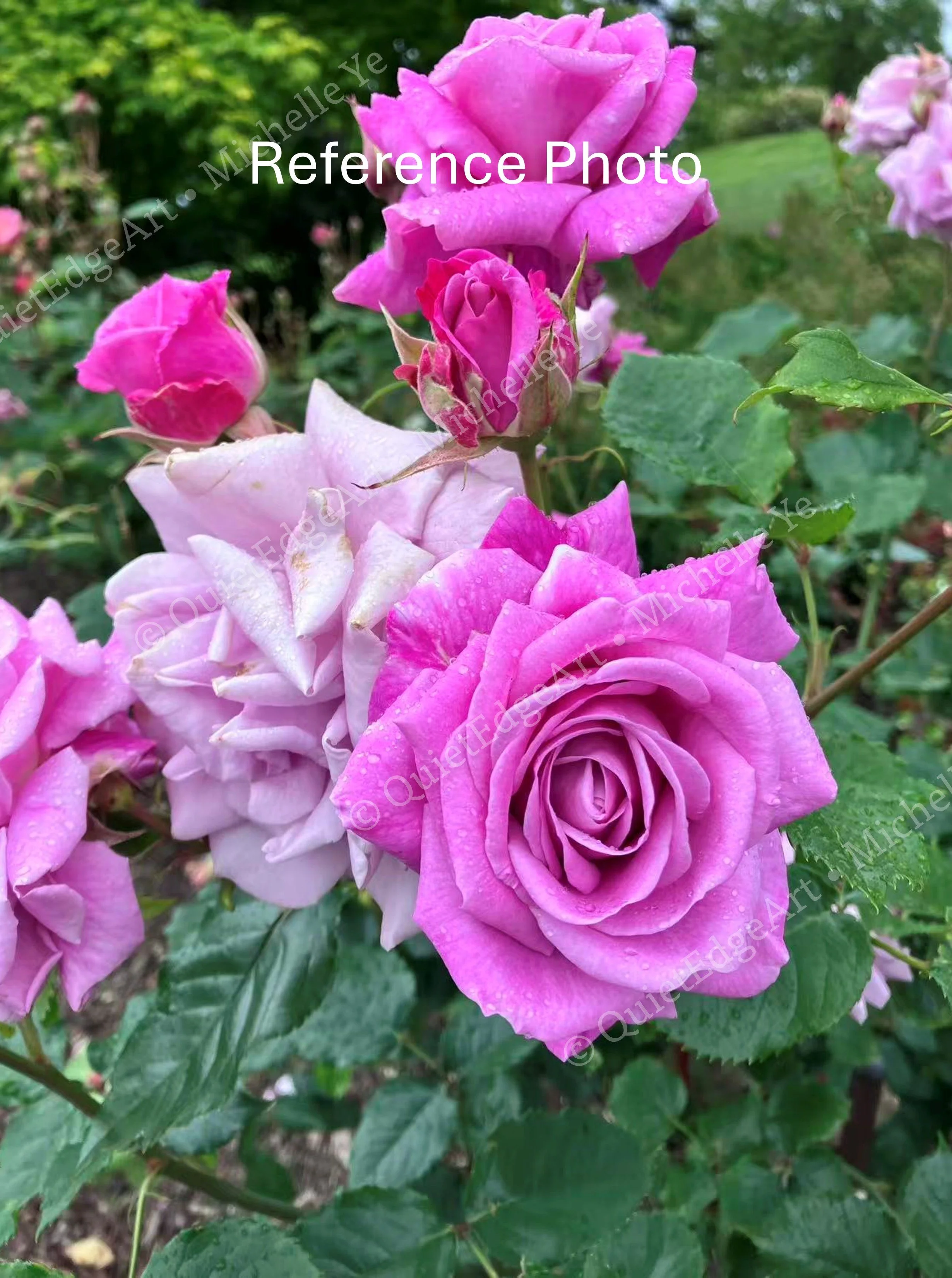 The reference photo was taken by Qin on her way to work through the University Rose Garden on the Queens Domain in Hobart, Tasmania. Pausing briefly in late spring, she captured the roses at a moment when they were full, open, and quietly abundant.