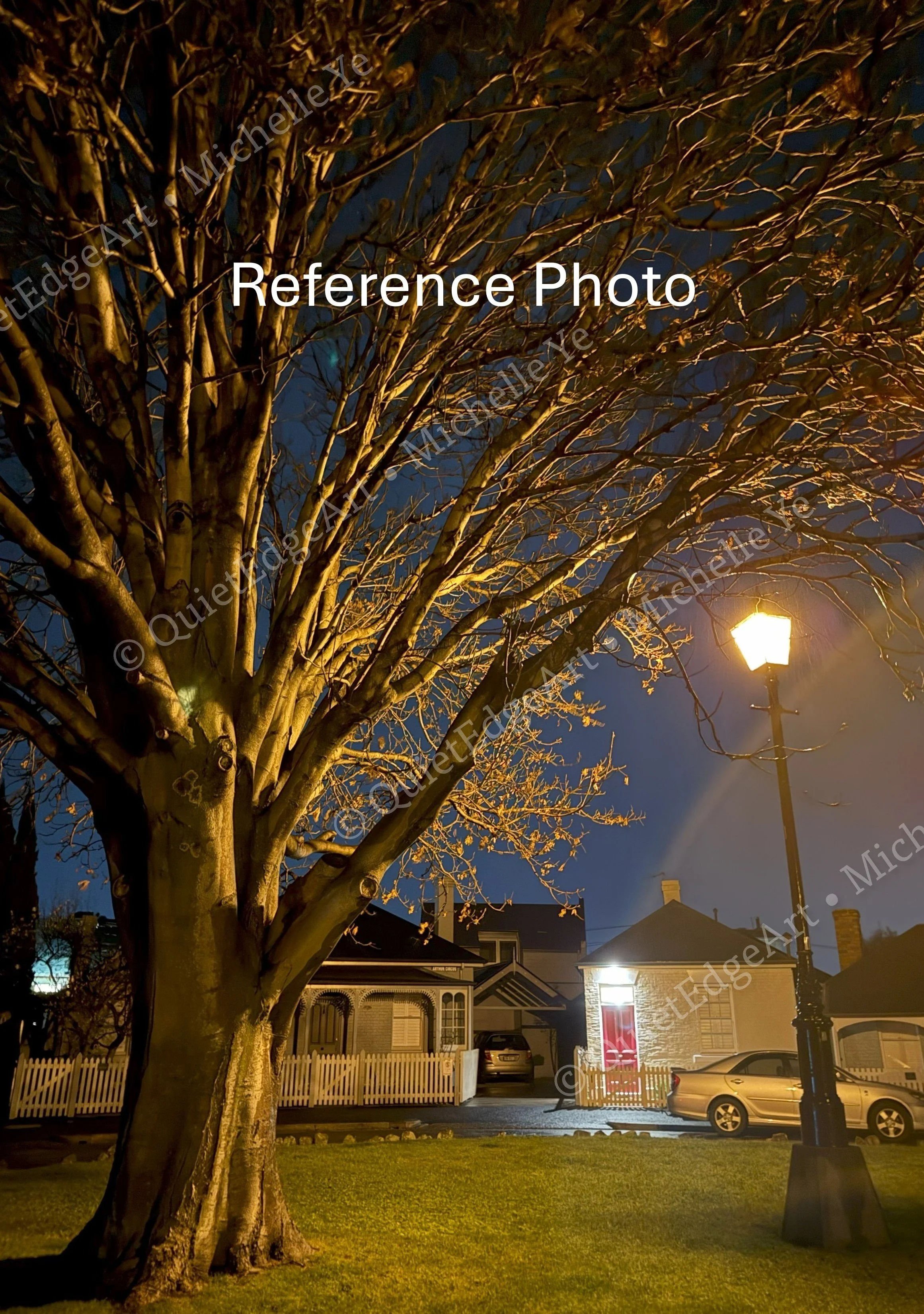 Inspired by an evening walk through Battery Point, Hobart, this piece captures the charm of Tasmaniaβs historic cottages illuminated under a soft amber streetlight. The play of light and shadow against the bare tree and red door reflects the areaβs timeless warmth - a quiet reminder of lifeβs gentle rhythms at the close of day.
