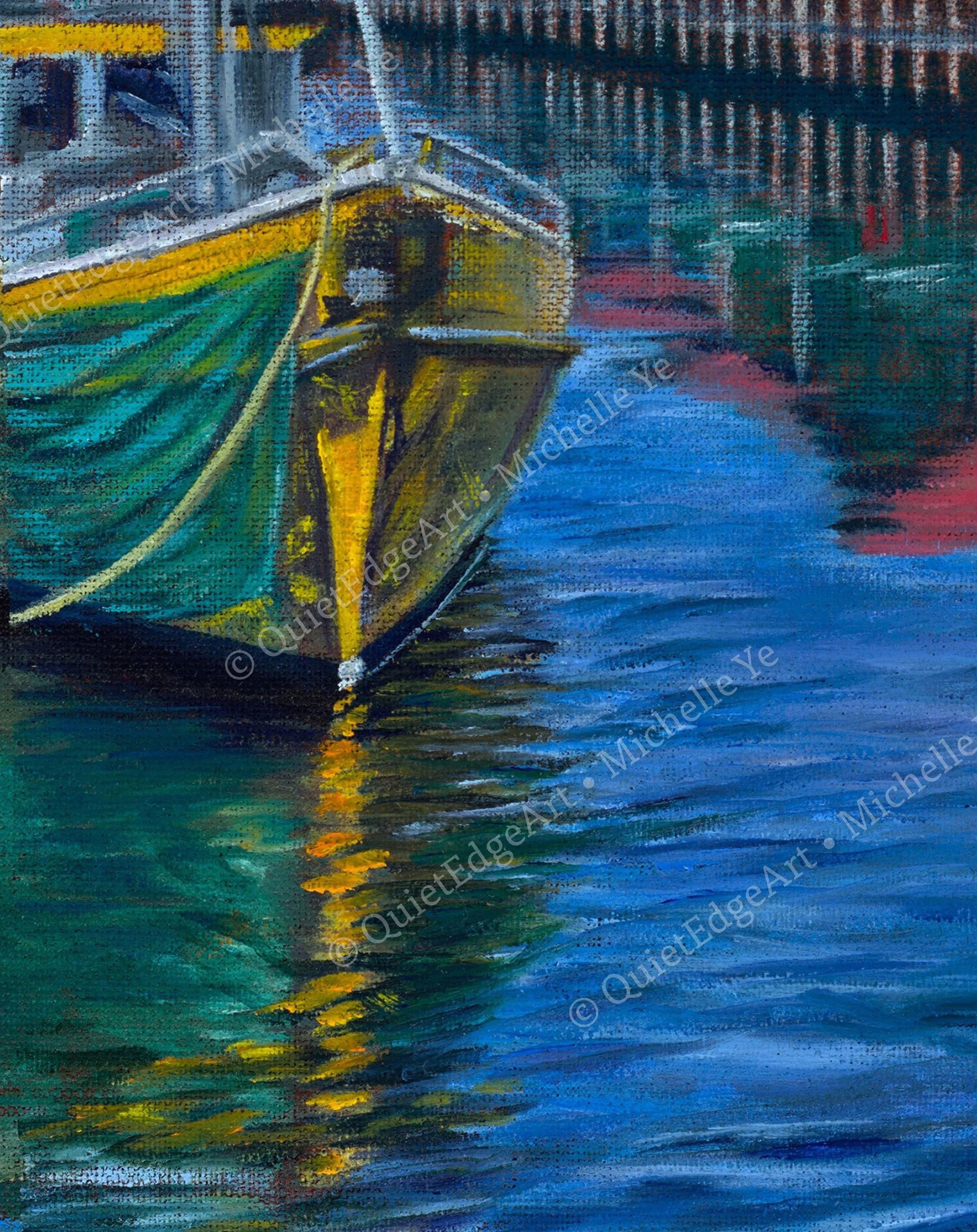 ‘Reflections Along the Wharf’ captures Hobart’s signature waterfront scene, where the red‑roofed, green‑fronted Mures restaurant shimmers across the harbour. The bright yellow boat and mirrored colours on the water highlight the iconic character of this beloved Tasmanian landmark.